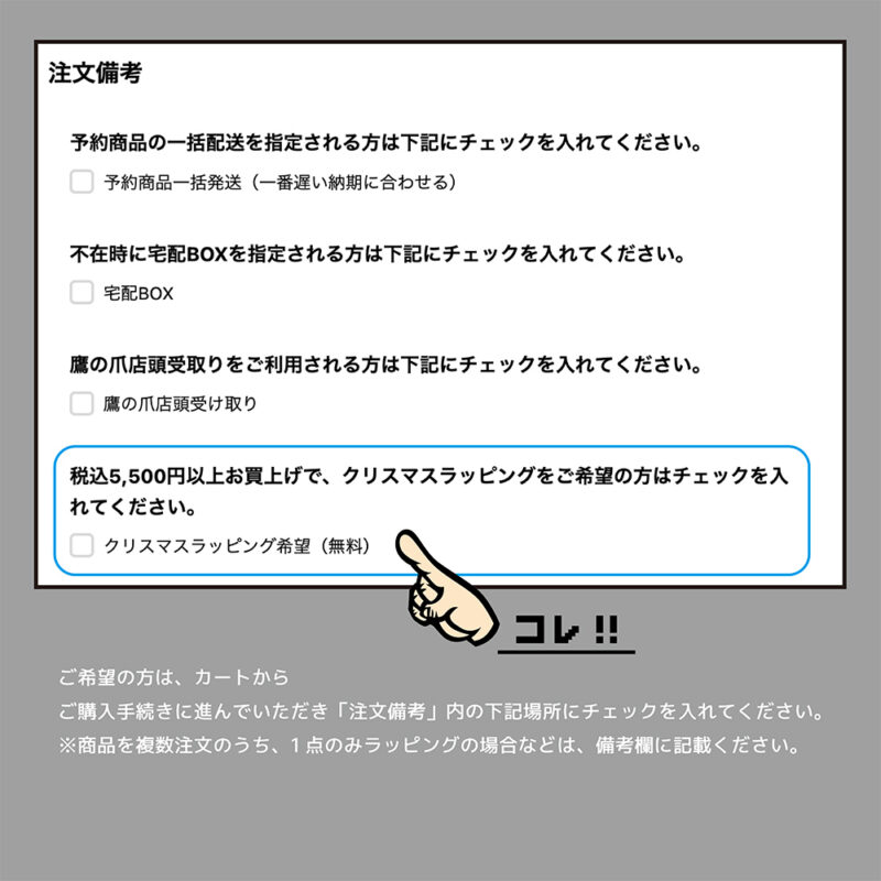 ご購入手続きに進んでいただき、「注文備考」内の下記場所にチェックを入れてください。